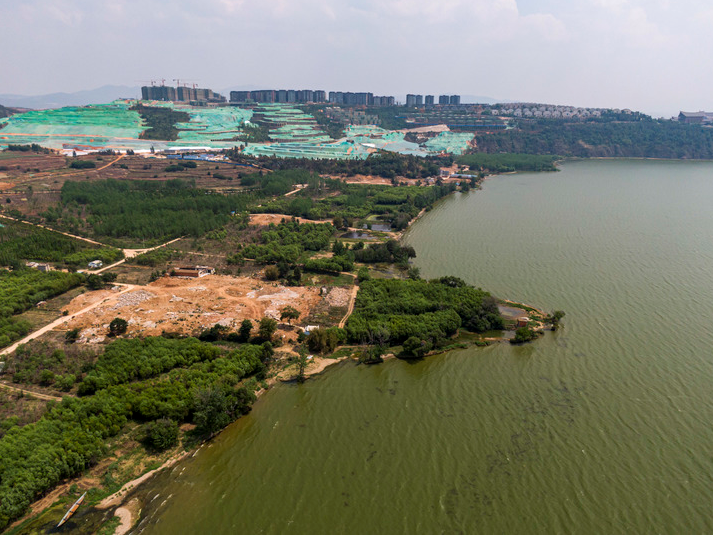空中远眺滇池边的长腰山(2021年4月26日摄无人机照片)