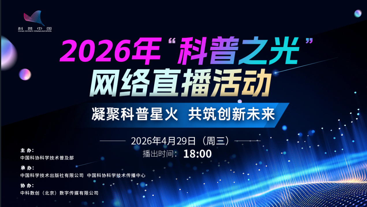 科学普及如何实现“破圈”?科技与人文又该如何跨界融合?由中国科协科普部主办,中国科学技术出版社有限公司、中国科协科学技术传播中心共同承办的2026年“科普之光”网络直播活动将于2026年4月29日(星期三)18时正式播出,精彩亮点抢先看!